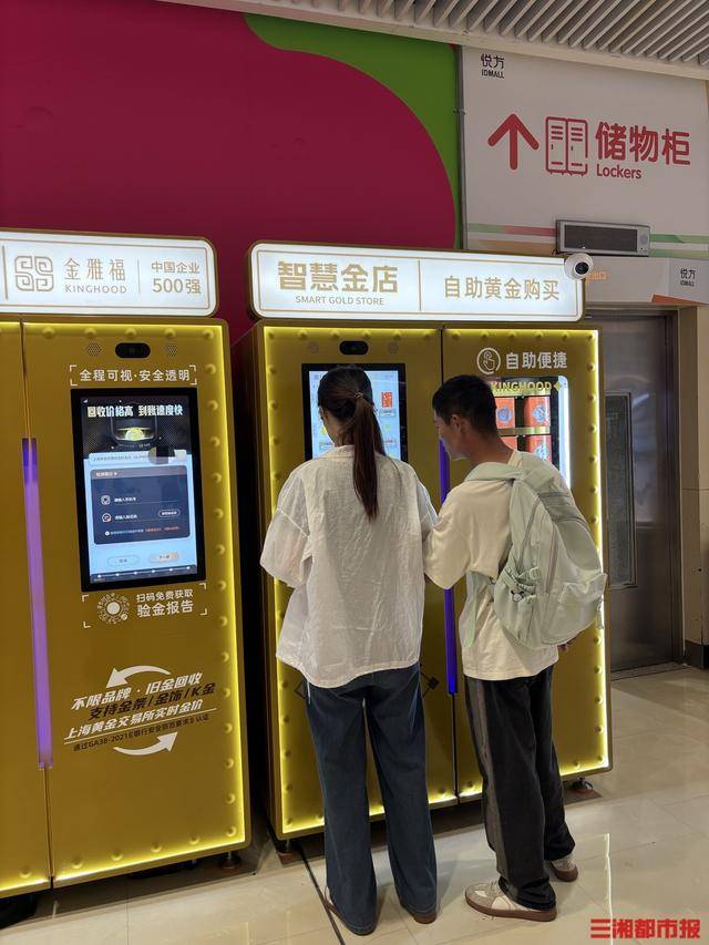 10月14日,记者在长沙悦方ID MALL负一楼看到,两台金色外观、酷似饮料贩卖机的设备内摆放有黄金饰品,不断吸引路过的顾客驻足查看。现场有消费者正滑动屏幕,浏览挑选售卖的黄金产品,设备内在售商品丰富,涵盖黄金盲盒、手机金贴、金条、金豆及吊坠等,价格清晰标注,例如1克金豆盲盒售价893.2元,0.1克手机贴158元,0.23克吊坠600元。